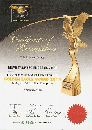 In 2014, Biovista was proud to receive another award which was the "Excellent Eagle" Golden Eagle Award 2014 (Malaysia 100 Excellent Enterprises). The Golden Eagle Award, organized by Nanyang Siang Pau, aims to honor the best of Malaysian businesses by giving them due recognition for their hard-earned success and outstanding achievements.